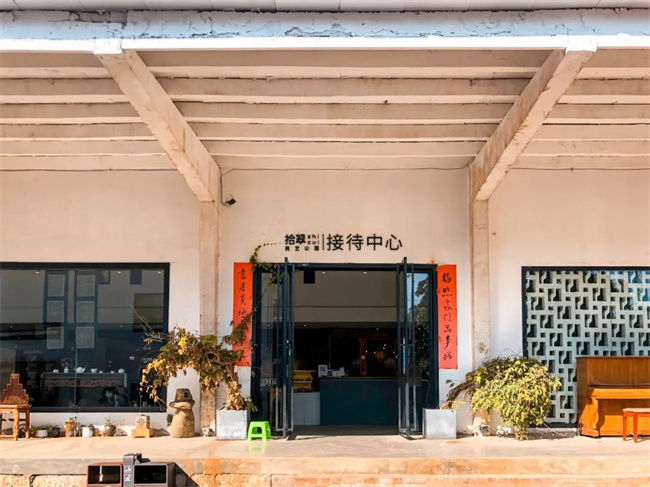 從金鼎山北路14號下車時,一棟巨大的白色建筑便呈現(xiàn)在每一位來者的眼前。沒有巨大的招牌,“拾翠民藝公園”幾個白色的字體就這么立在路邊,低調(diào)到不想讓人發(fā)現(xiàn)它一般。穿過地面鋪設(shè)的石板路,走到接待中心跟前細(xì)細(xì)打量——這里還殘留著舊時工廠的痕跡。