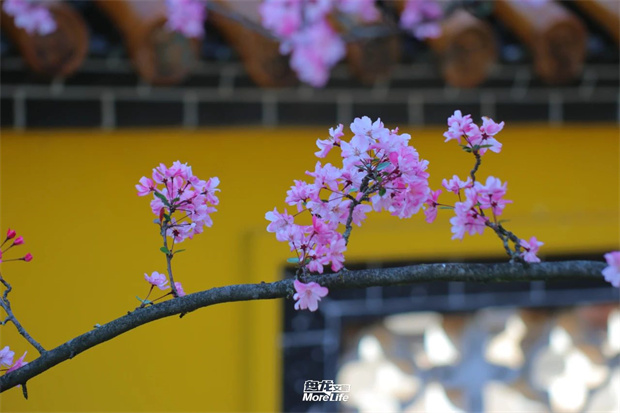 當(dāng)梅香褪去最后一縷暗香,公園里的垂絲海棠正以漫天緋云的姿態(tài),在古建筑群中織就層層疊疊的春意。有的花枝疊影