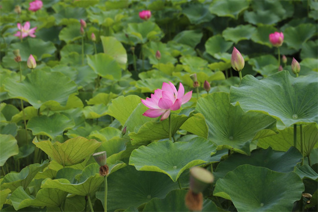 到了正午,荷花全然綻放。粉的嬌艷,白的素凈,在綠葉襯托下格外醒目。陽光直射,照得花瓣幾乎透明,能看清纖細