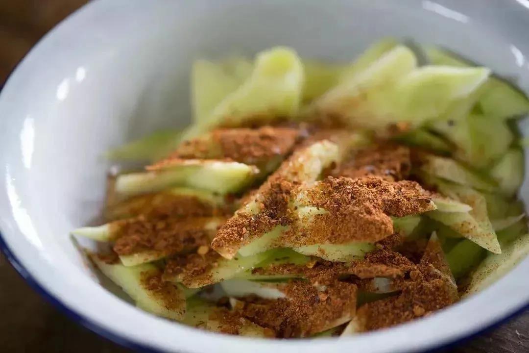 水果+辣椒會(huì)產(chǎn)生令人味蕾愉悅的奇妙化學(xué)反應(yīng):比如沒(méi)有成熟的芒果的香酸味,去皮削成條狀,舀一勺辣椒面,抖上兩抖,入口清爽鮮脆,怎一個(gè)爽字了得!