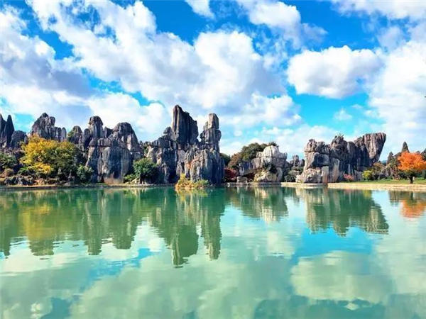 不同于石林風景區,石林長湖是真正山水相連的地方。這里湖水清澈平靜,魚兒眾多,空氣清新。岸邊青山綠樹倒映,讓人心曠神怡。