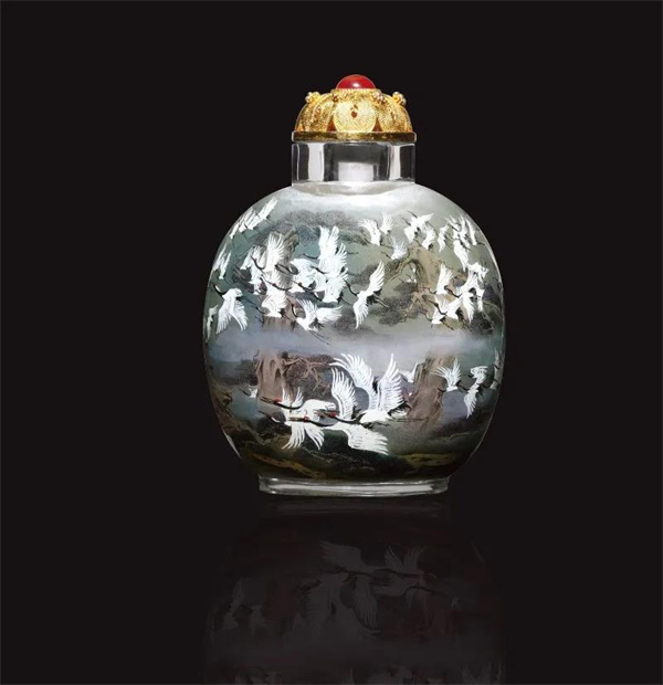 其中,最引人注目的是《百鶴圖》,這也是她最滿意的作品。其主要依托于云南黑頸鶴,以及她對云南少數民族地域文化的熱愛。從構圖到繪畫過程中,全是一氣呵成的,整個作品完成需要4個月。她通過內畫技藝,將云南的山水盡收瓶中,綻放出奪目光彩。