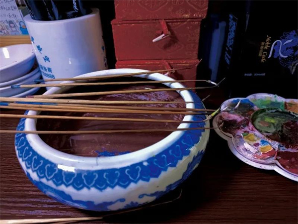 “要學內畫,先得學做筆”這是孫鴻雁經常對她的學生說的一句話。據了解,這個畫筆在傳統內畫基礎上改革創新了幾次。傳統筆桿用的是鐵絲,而滇派內畫選用的是金竹。新鮮的竹子曬一年半左右,可以保持一定水分又不會太干,彎曲后可以回到原處,如此作出的畫筆,無論從細度、弧度,還是韌性上,都更適合于在狹小的瓶內空間創作,穿梭在狹窄的瓶口,游刃有余。